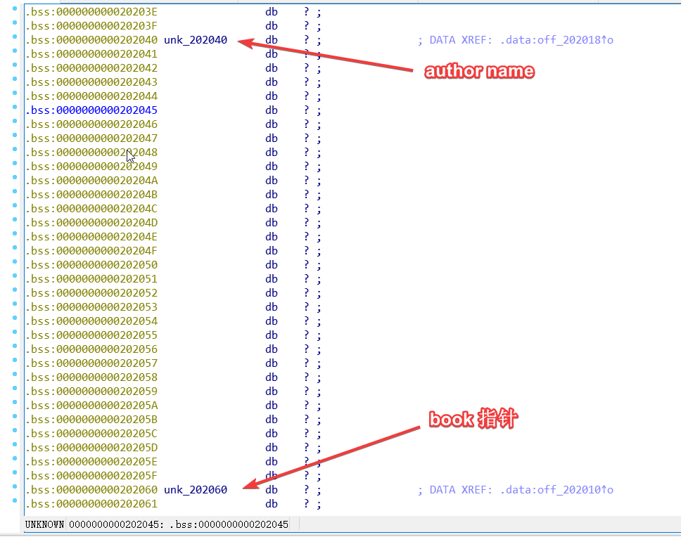 在我们输入 author 的时候,系统会创建一个数组放在 .bss 段的一个位置,而这个位置刚好就在保存的 book 指针的正上方(如下图)