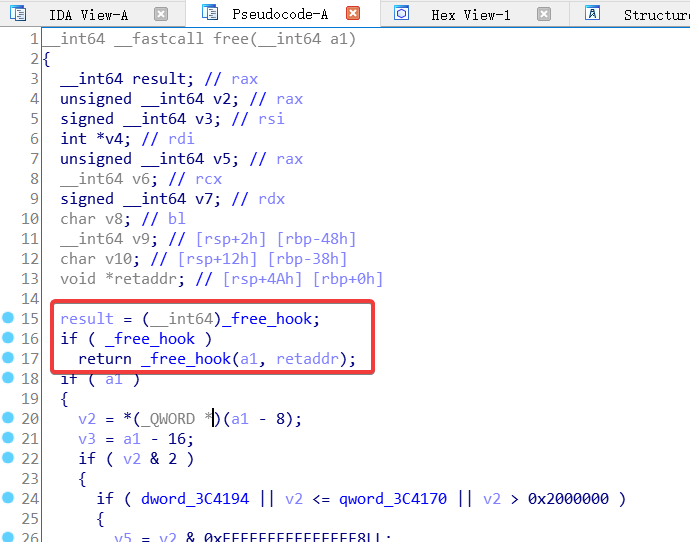 可以看到,当 _free_hook 存在时,会直接返回它,我们跟进去可以看到它是一个名为**__free_hook** 的字符串(注意是两个“_”),这一点我们也可以在字符串窗口验证,搜索也可以到这个字符串