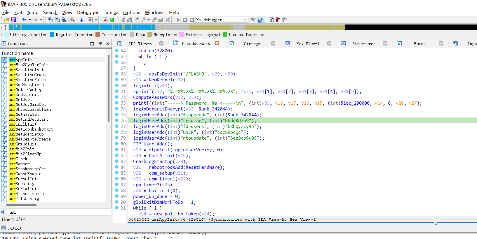 最终在usrAppInit发现有硬编码账户的存在(vxWorks提供了一个用户接口usrAppInit,所以可以直接从该函数看)