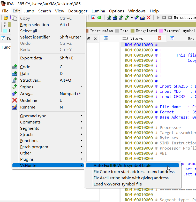 但是此时IDA还是不能很好的识别出所有函数,和之前的差别不大,所以考虑使用vxhunter脚本来进行恢复,将py3版本的脚本下载好后放入ida的plugins目录中进行使用